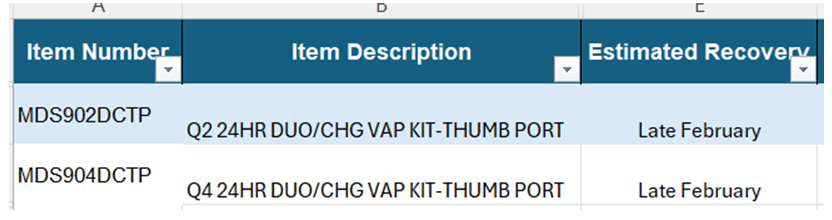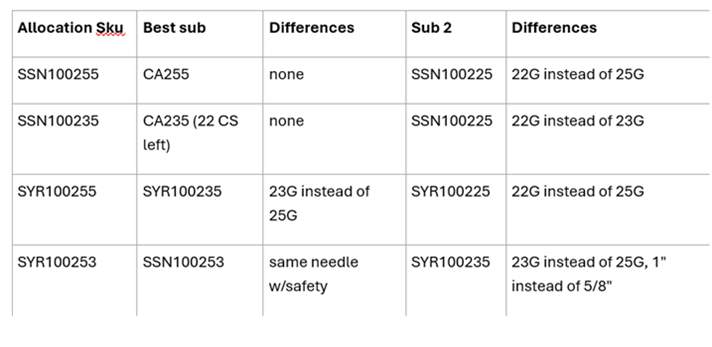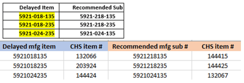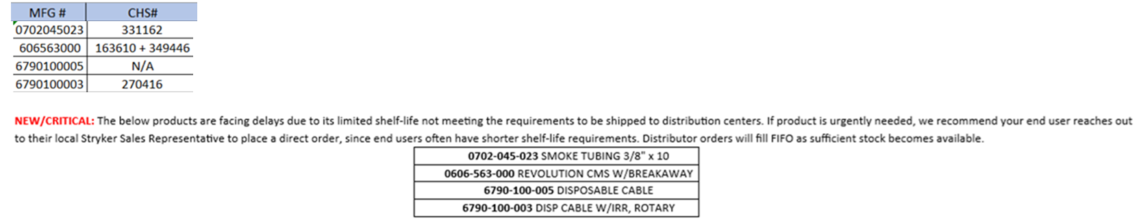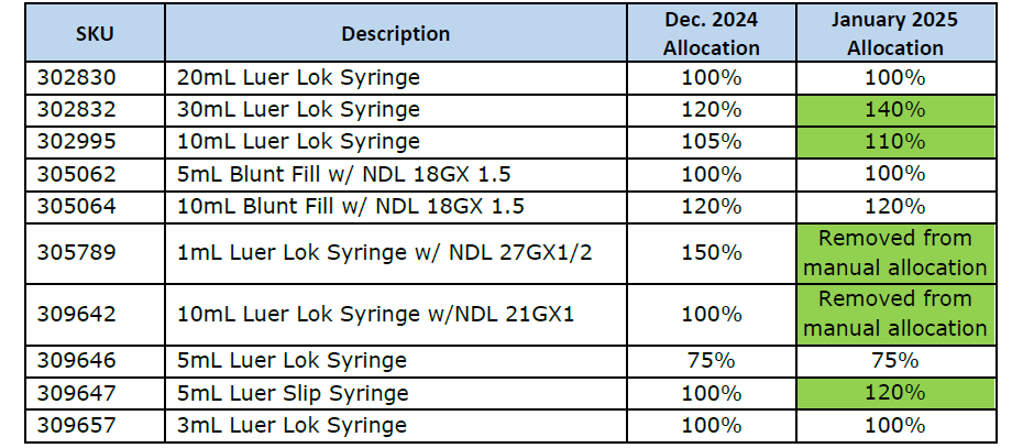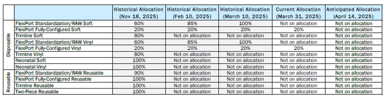 Hello,Please see below and attached regarding an allocation from Solventum V#10296. An updated usage file is attached.CHS#106463 (mfg#9200) - 50% allocation thru 12/31/25.CHS#177643 (mfg#9216) - Backordered until February 28, 2026.CHS#105809 (mfg#9222) - Backordered until February 28, 2026.Please reach out to Tricia Wentling if you have further questions.Communication Type:
