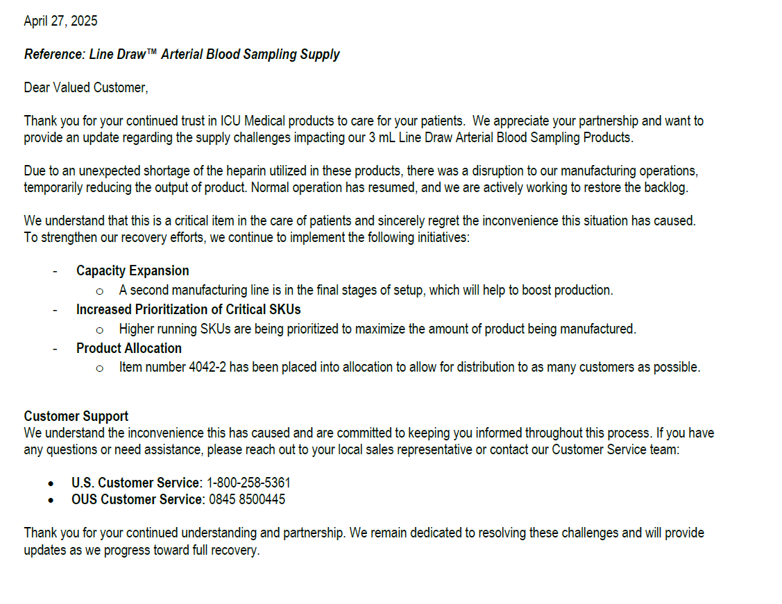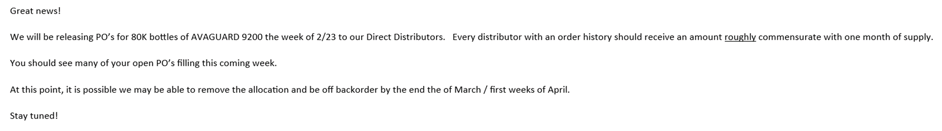 When product demand outpaces supply, we may need to allocate certain Adult Oral Nutrition Supplement SKUs, and currently we are proactively managing orders to deliver products to as many patients as possible. These product allocations will be based on historical demand of your acute care customers. Accordingly, Abbott requests you make these Adult Oral Nutritional Supplement product allocations initially available to fulfill your acute care customers’ demand.