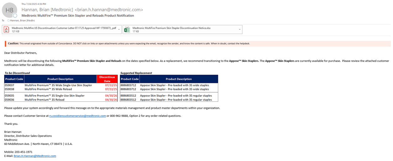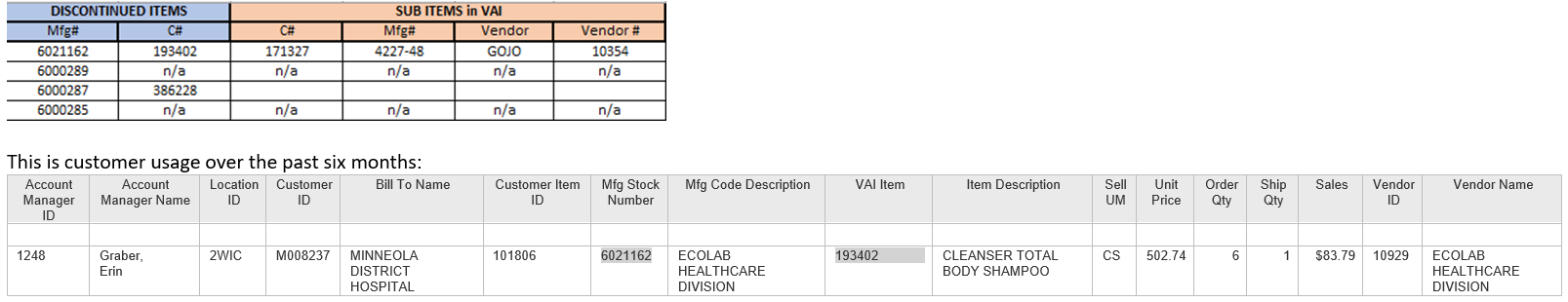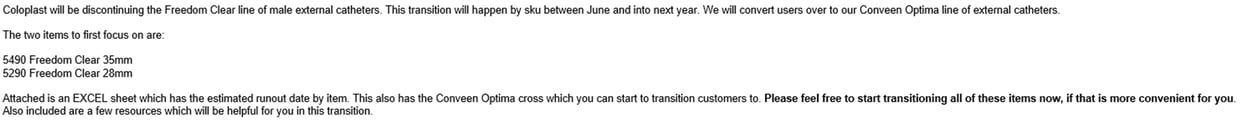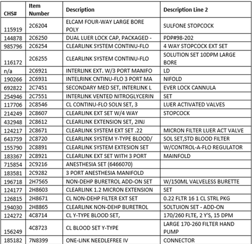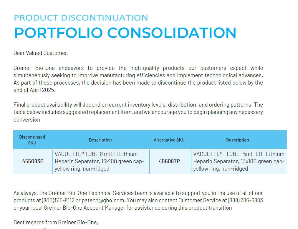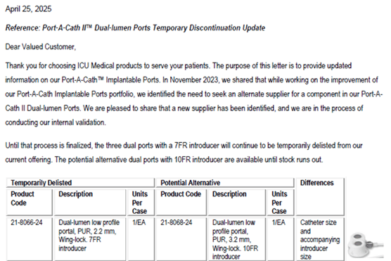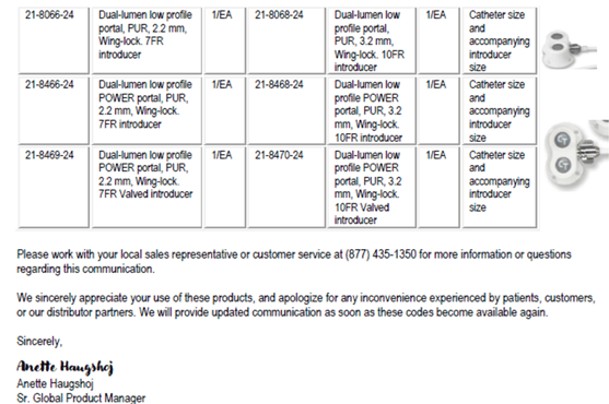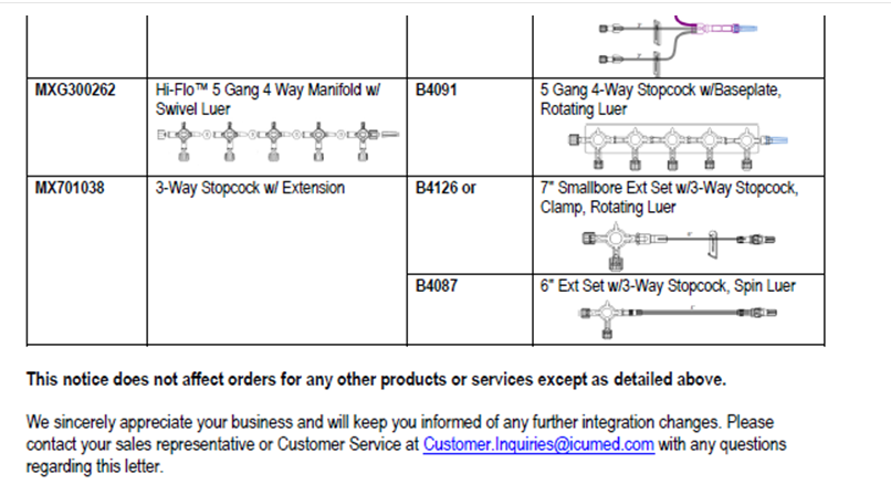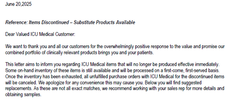 Hello,Please see below and attached letter regarding discontinued items from Teleflex V#10538. I have attached a usage file for the last six months.These items have been placed in item inactivation: