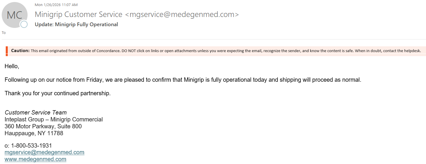 Our thoughts are with our teammates, the frontline humanitarian and emergency responders, and the entire Buncombe County community as they navigate this difficult time. Owens & Minor is committed to providing customers with timely information about our Asheville operations, and we will share additional updates as the recovery continues.With any further questions, please reach out to Supplier Relations.