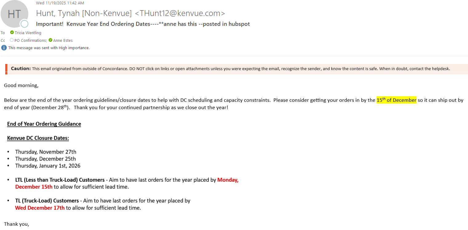 Please see attached from Kimberly Clark regarding their end of year shipping schedule.